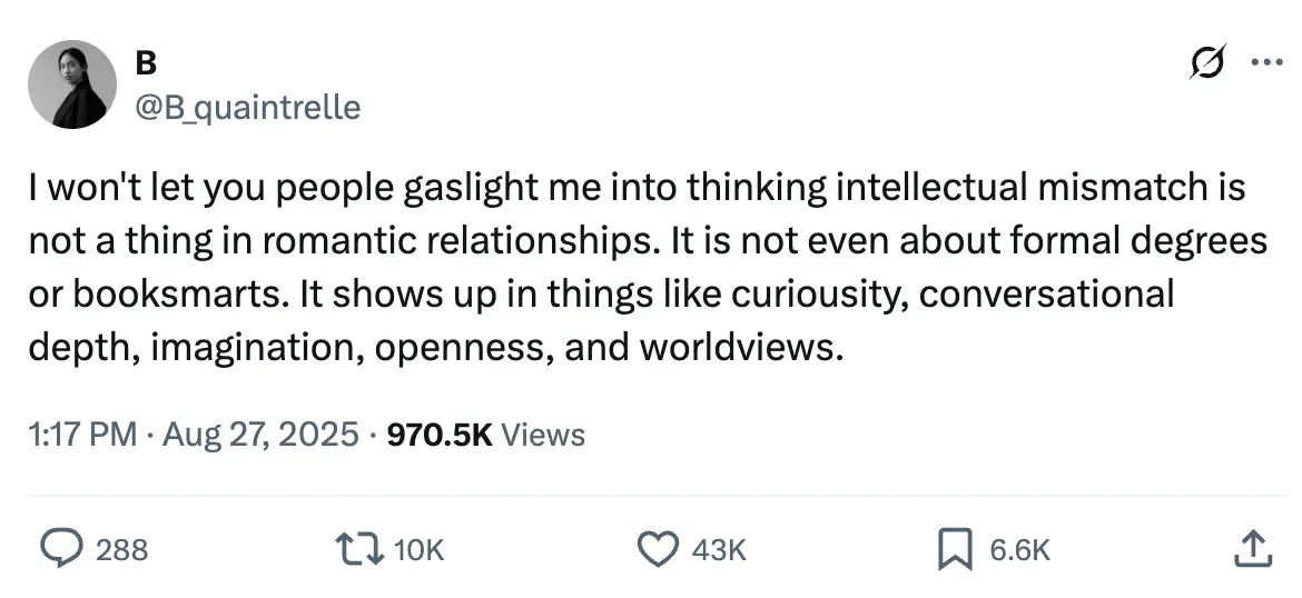 What are the noun and verb forms of X? “An X”? “to X”? Anyway, this X had me thinking. Intellectual compatibility exists, but I think it’s revealed less by reading the same number of books in a year than by how deep two people are willing to go into the same conversation pit.