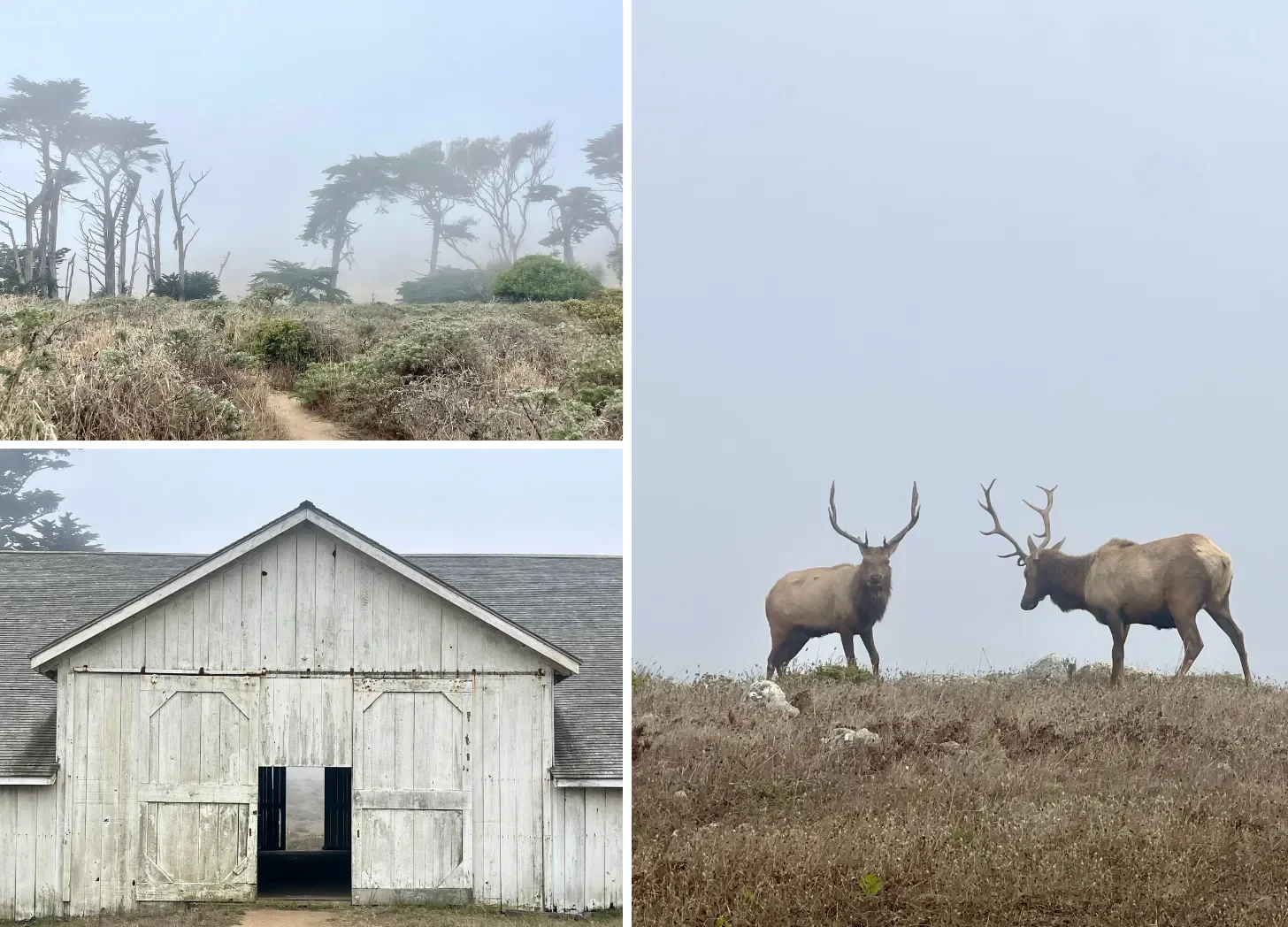 Hey there. Last weekend I went to Point Reyes for the “elk hike,” or Tomales Point Trail, which guaranteed an elk sighting, according to a friend. Although the Marin County weather disappointed (nippy, low viz), the elk did not. Please admire my Nat Geo quality photos below.